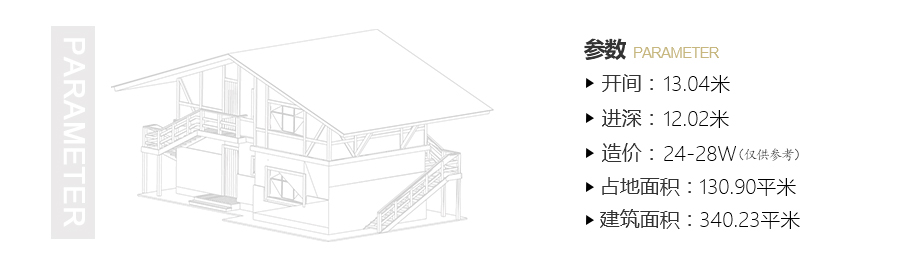 開間:13.04米 | 進深:12.02米 | 占地面積:130.9平方米 | 建筑面積:340.23平方米 |