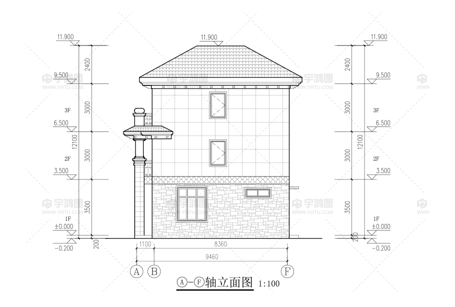 風格:歐式 | 層數:三層 | 結構形式:磚混結構 | 圖紙編號:YH-A-3099 |