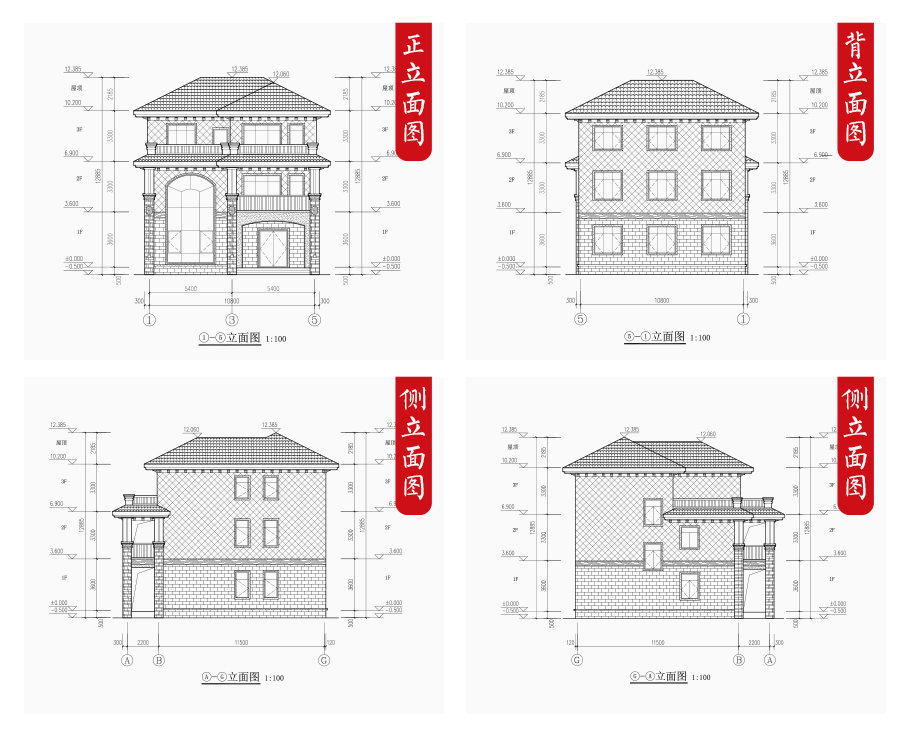 建筑圖: | 建筑平面圖:一層平面圖,二層平面圖,三層平面圖; 建筑立面圖:東立面圖,西立面圖,南立面圖,北立面圖,剖面圖; 大樣圖:樓梯詳圖,細部大樣,門窗大樣 |