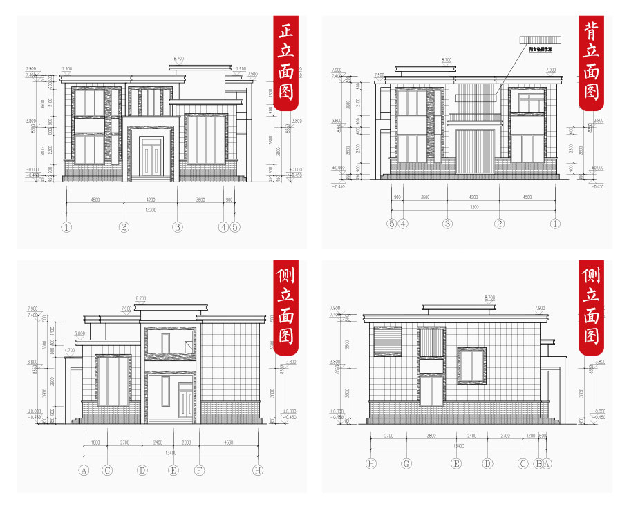 建筑圖: | 建筑平面圖:一層平面圖,二層平面圖; 建筑立面圖:東立面圖,西立面圖,南立面圖,北立面圖,剖面圖; 大樣圖:樓梯詳圖,細部大樣,門窗大樣 |