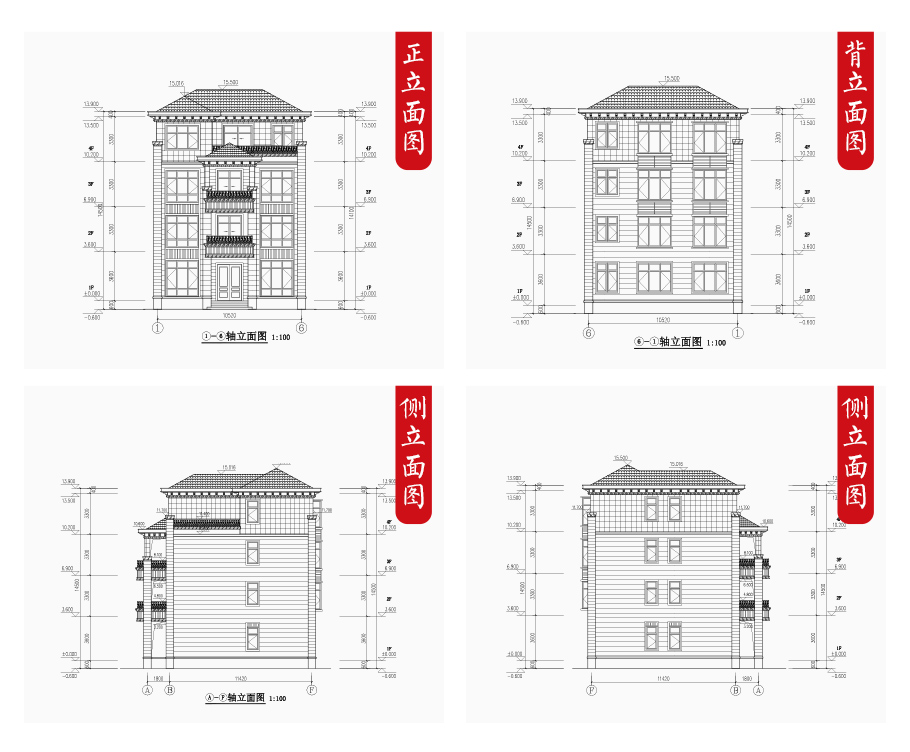 建筑立面圖:東立面圖,西立面圖,南立面圖,北立面圖,剖面圖;