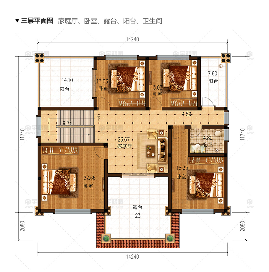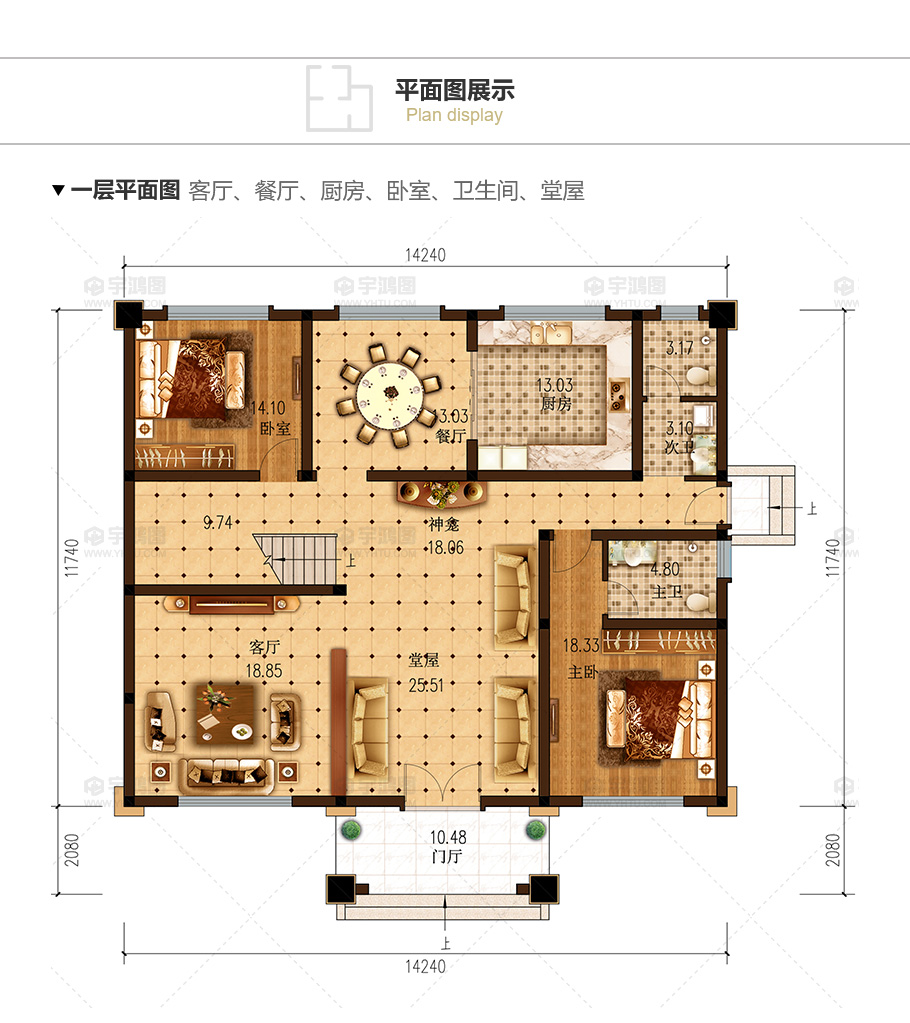 開(kāi)間:14.24米 | 進(jìn)深:13.82米 | 占地面積:167.2平方米 | 建筑面積:487平方米 |