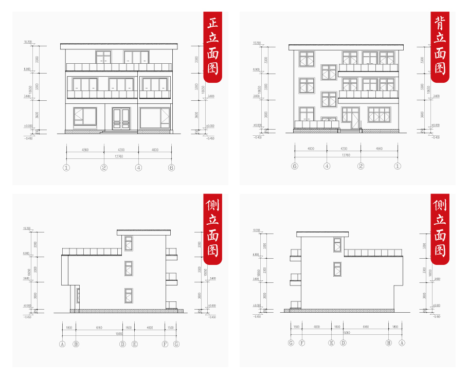 建筑立面圖:東立面圖,西立面圖,南立面圖,北立面圖,剖面圖;