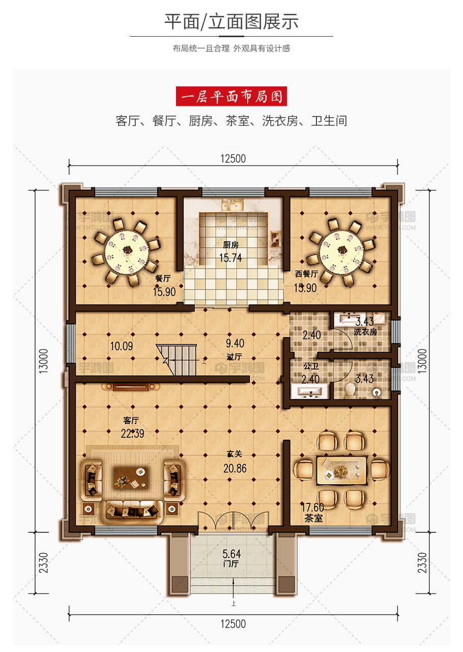 開(kāi)間:12.5米 | 進(jìn)深:15.33米 | 占地面積:162.5平方米 | 建筑面積:465平方米 |