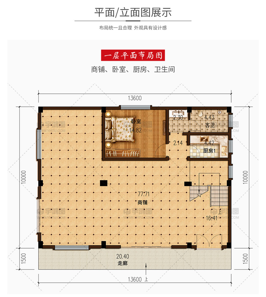 開間:13.6米 | 進深:11.5米 | 占地面積:156.4平方米 | 建筑面積:694平方米 |