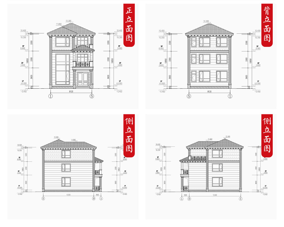 建筑立面圖:東立面圖,西立面圖,南立面圖,北立面圖,剖面圖;