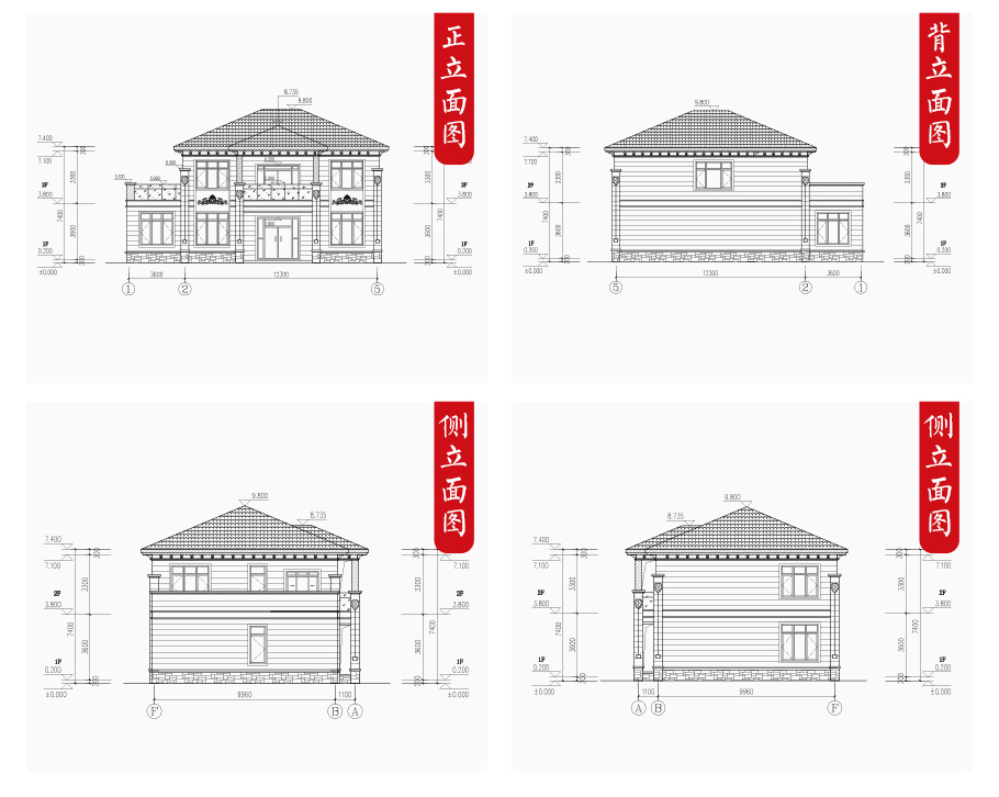 建筑圖: | 建筑平面圖:一層平面圖,二層平面圖; 建筑立面圖:東立面圖,西立面圖,南立面圖,北立面圖,剖面圖; 大樣圖:樓梯詳圖,細部大樣,門窗大樣 |