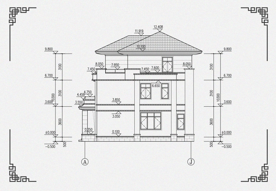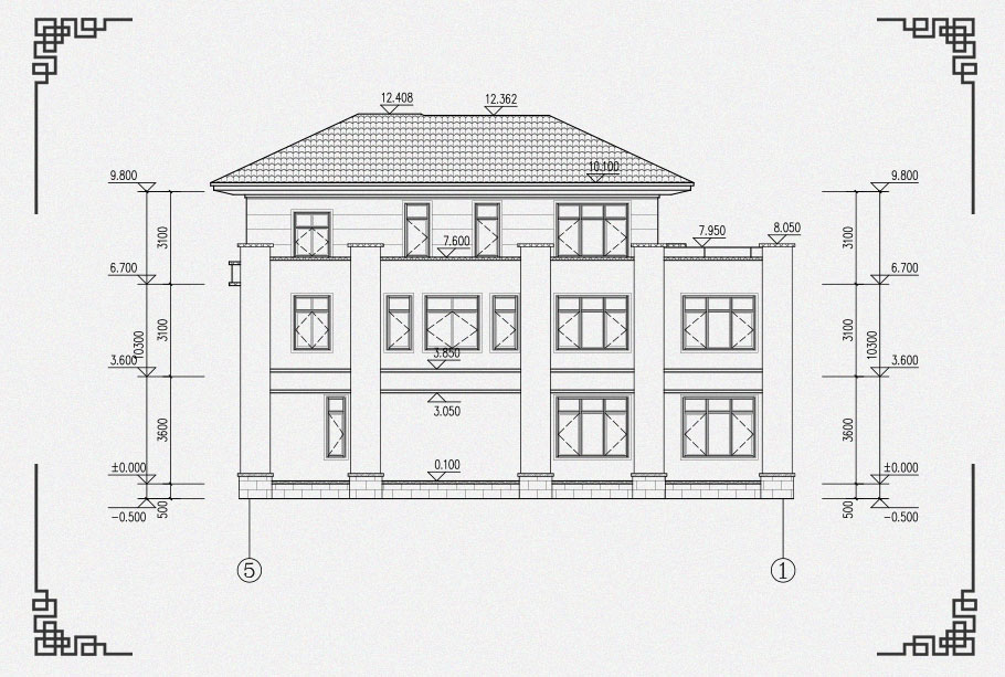 建筑立面圖:東立面圖,西立面圖,南立面圖,北立面圖,剖面圖;