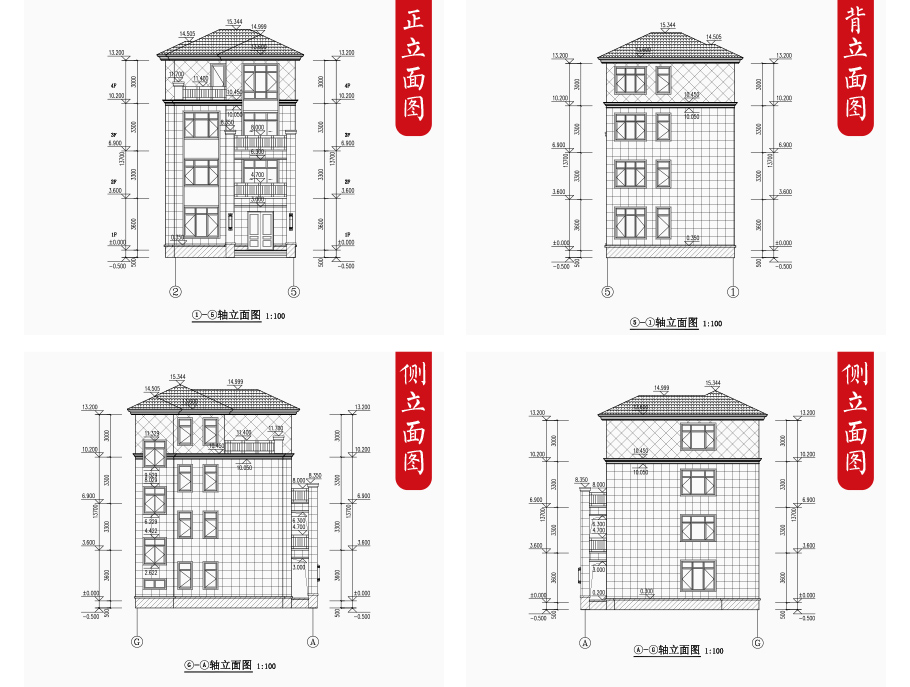 建筑立面圖:東立面圖,西立面圖,南立面圖,北立面圖,剖面圖;