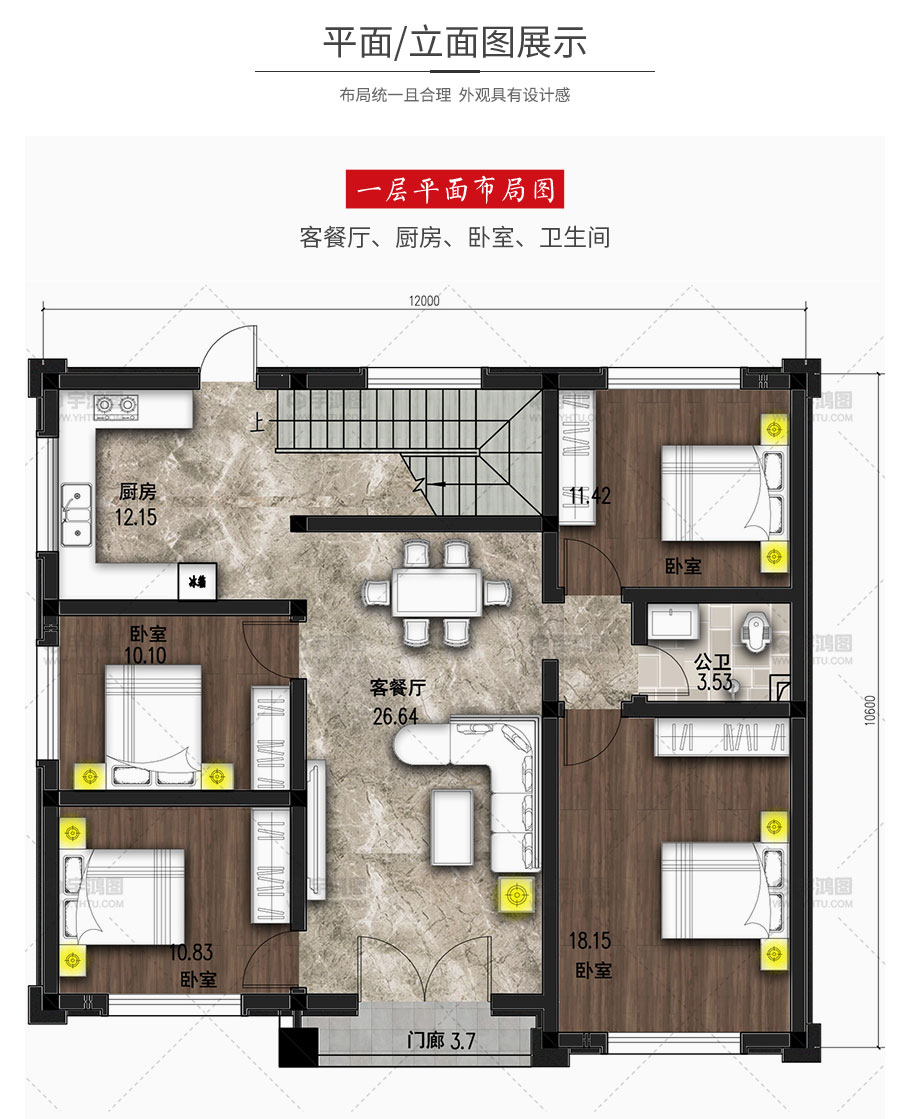 開間:12米 | 進深:10.6米 | 占地面積:122.5平方米 | 建筑面積:203平方米 |