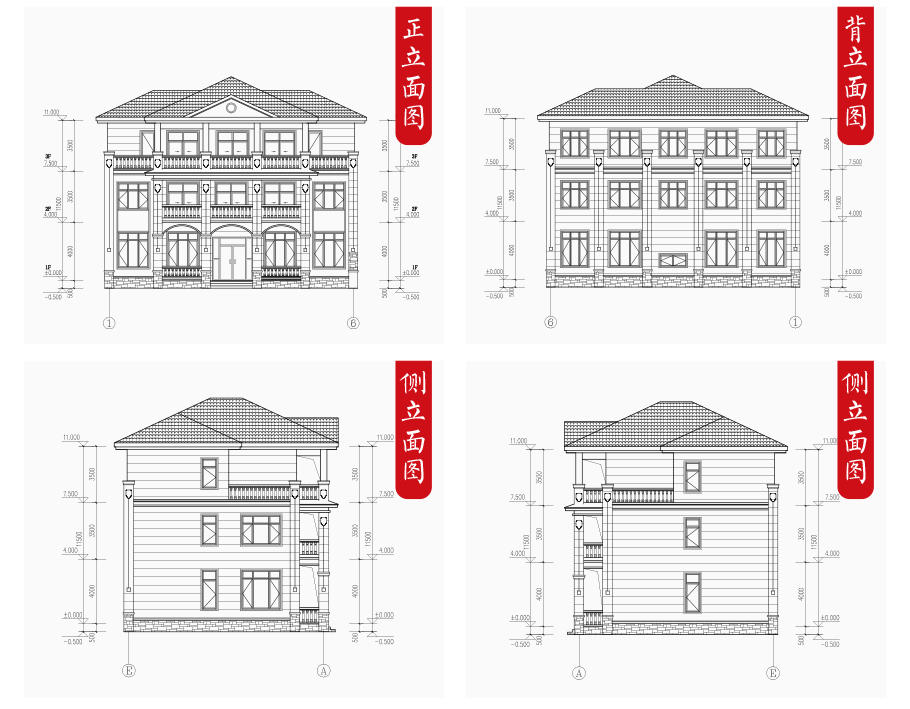 建筑立面圖:東立面圖,西立面圖,南立面圖,北立面圖,剖面圖;