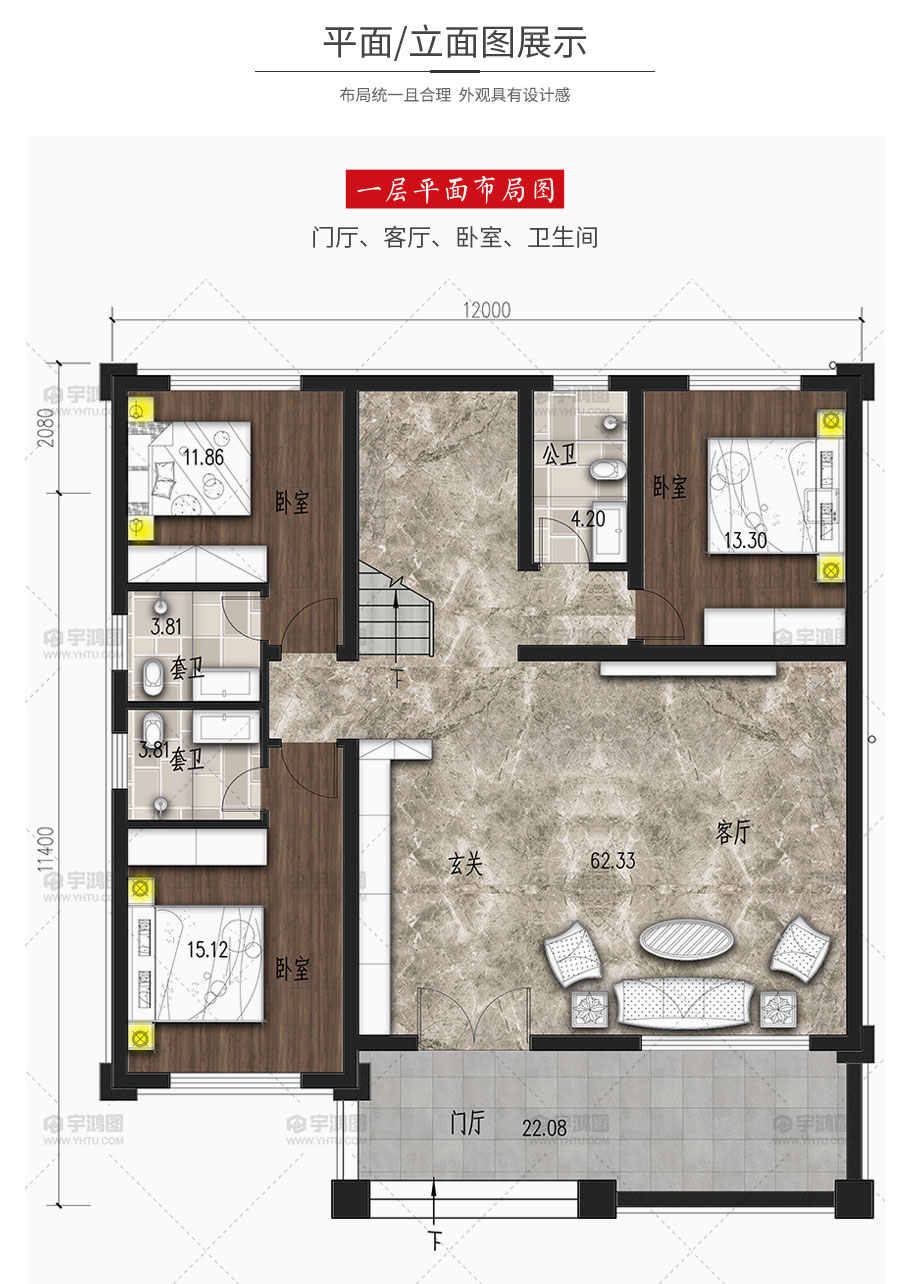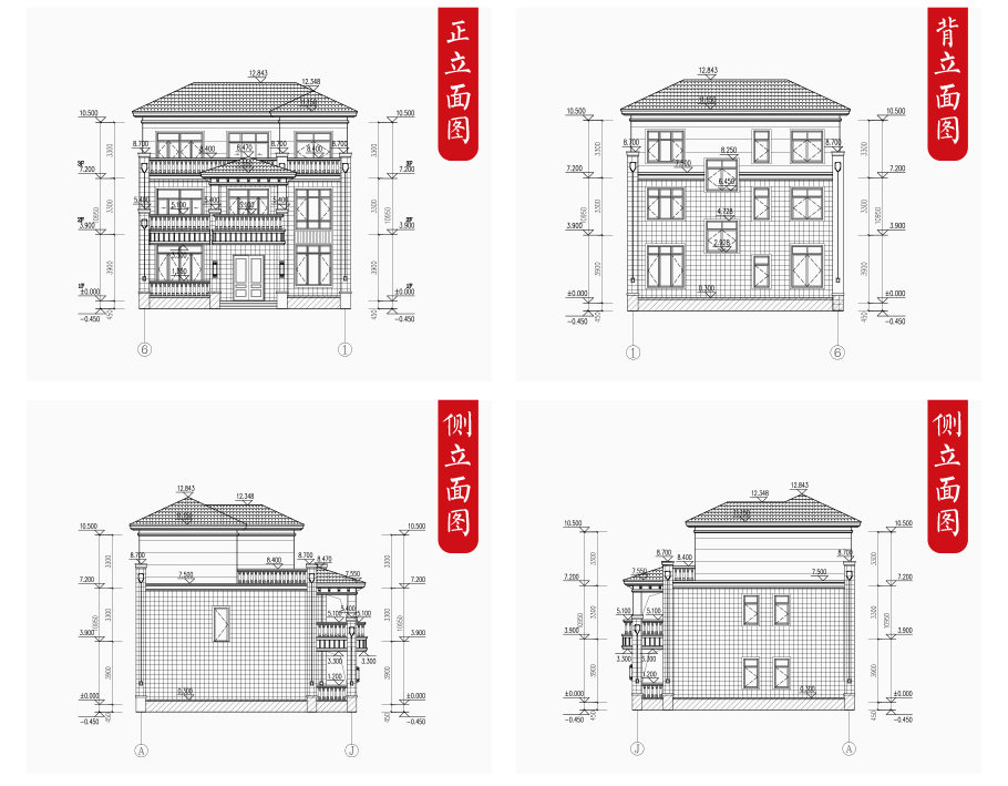 建筑立面圖:東立面圖,西立面圖,南立面圖,北立面圖,剖面圖;