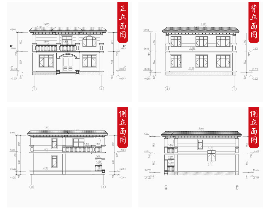 建筑立面圖:東立面圖,西立面圖,南立面圖,北立面圖,剖面圖;
