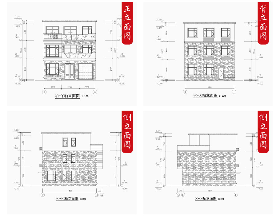建筑立面圖:東立面圖,西立面圖,南立面圖,北立面圖,剖面圖;