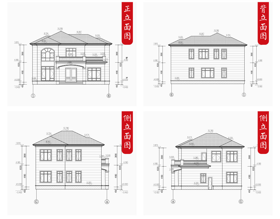 建筑圖: | 建筑平面圖:一層平面圖,二層平面圖; 建筑立面圖:東立面圖,西立面圖,南立面圖,北立面圖,剖面圖; 大樣圖:樓梯詳圖,細部大樣,門窗大樣 |