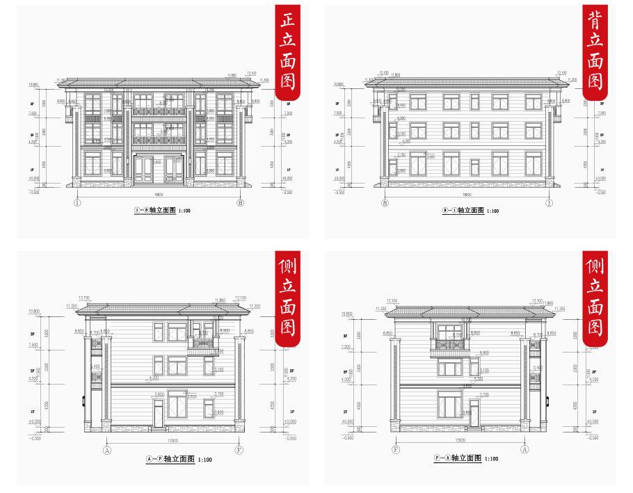 建筑立面圖:東立面圖,西立面圖,南立面圖,北立面圖,剖面圖;