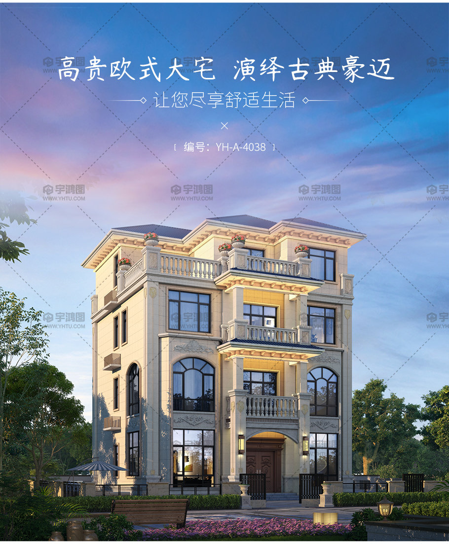 風格:歐式 | 層數:四層 | 結構形式:框架結構 | 圖紙編號:YH-A-4038 |