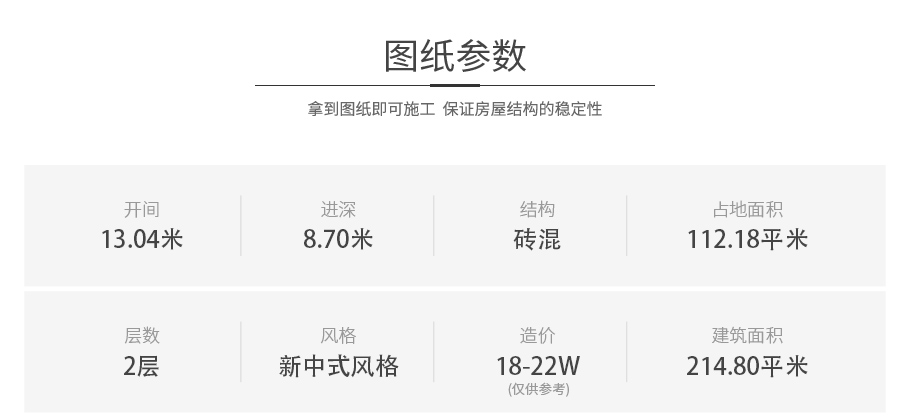 開間:13.04米 | 進深:8.7米 | 占地面積:112.18平方米 | 建筑面積:214.8平方米 |