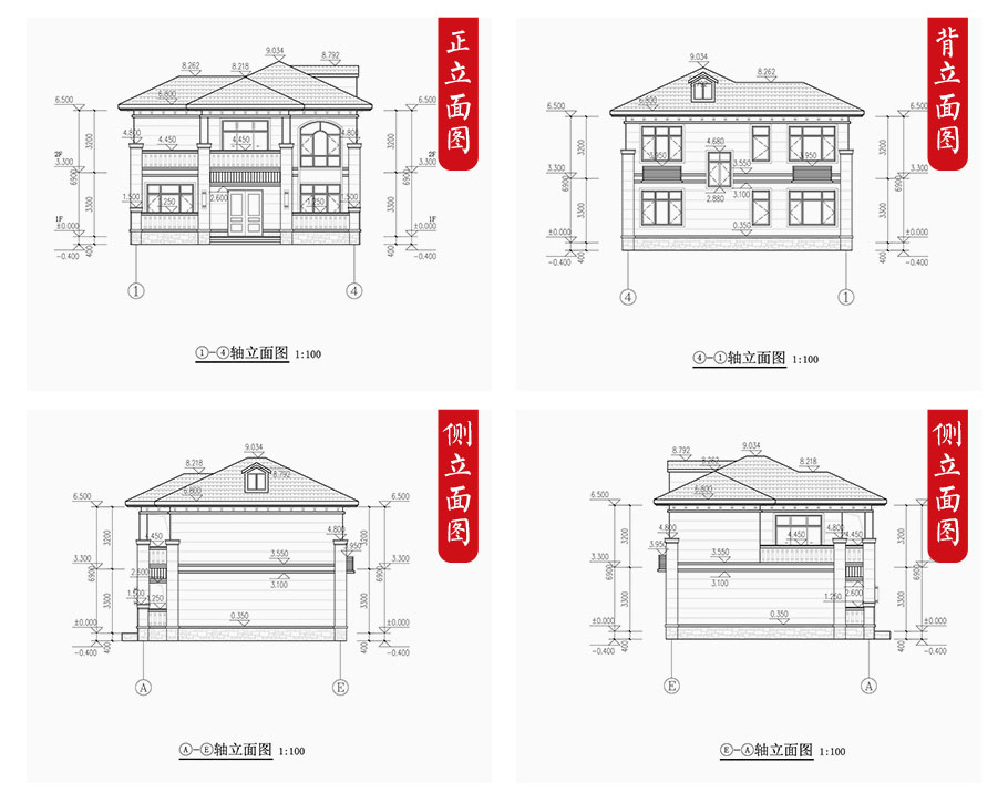 建筑圖: | 建筑平面圖:一層平面圖,二層平面圖; 建筑立面圖:東立面圖,西立面圖,南立面圖,北立面圖,剖面圖; 大樣圖:樓梯詳圖,細部大樣,門窗大樣 |