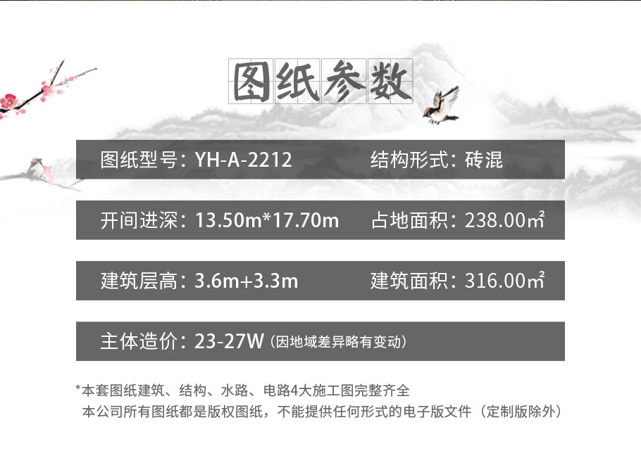 風格:中式 | 層數:二層 | 結構形式:磚混結構 | 圖紙編號:YH-A-2212 |
