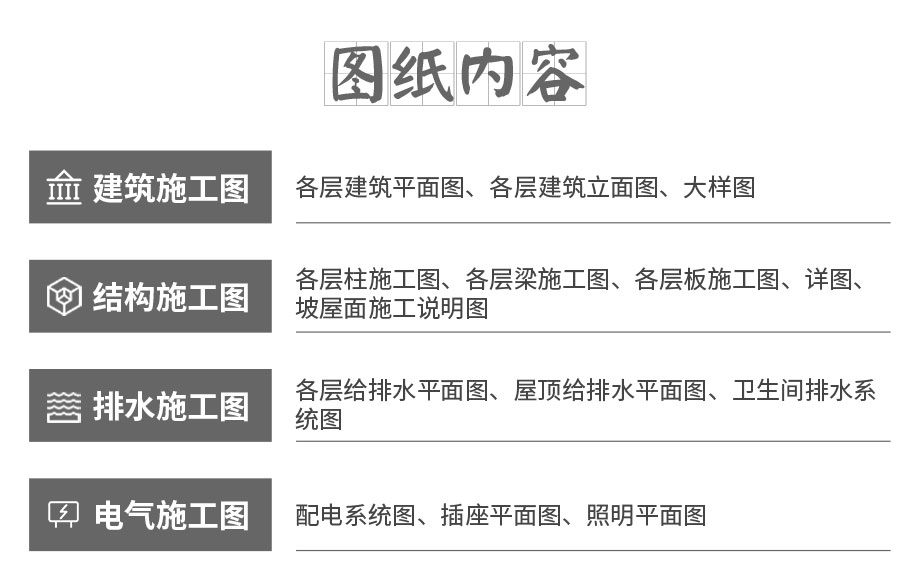 電氣圖: | 配電系統圖; 插座平面圖:一層插座平面圖,二層插座平面圖,屋頂層插座平面圖; 照明平面圖:一層照明平面圖,二層照明平面圖,屋頂照明平面圖接地平面圖,防雷平面圖 |
