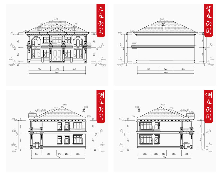 建筑圖: | 建筑平面圖:一層平面圖,二層平面圖; 建筑立面圖:東立面圖,西立面圖,南立面圖,北立面圖,剖面圖; 大樣圖:樓梯詳圖,細部大樣,門窗大樣 |