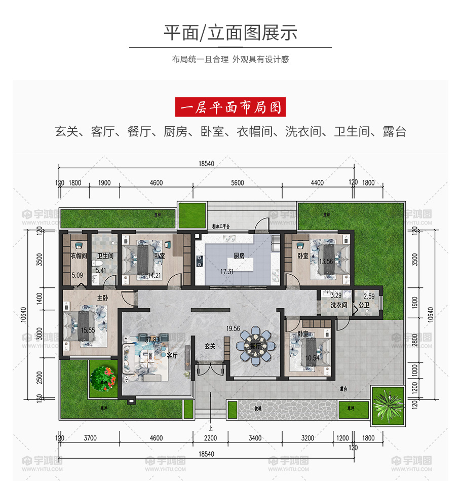 開(kāi)間:18.54米 | 進(jìn)深:10.64米 | 占地面積:182.05平方米 | 建筑面積:177.55平方米 |