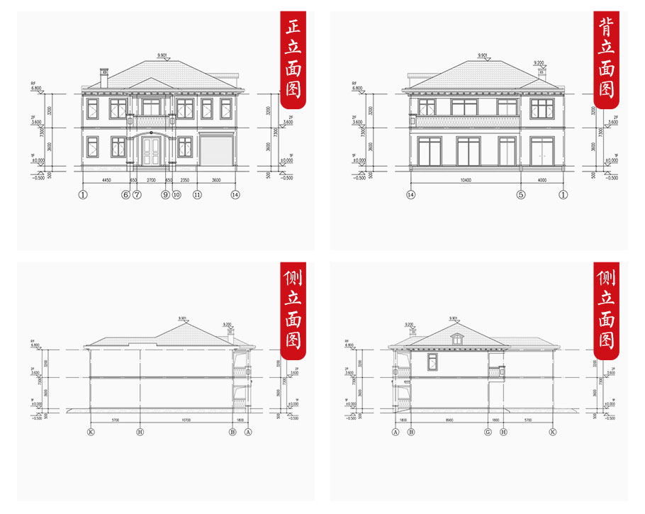 建筑圖: | 建筑平面圖:一層平面圖,二層平面圖; 建筑立面圖:東立面圖,西立面圖,南立面圖,北立面圖,剖面圖; 大樣圖:樓梯詳圖,細部大樣,門窗大樣 |