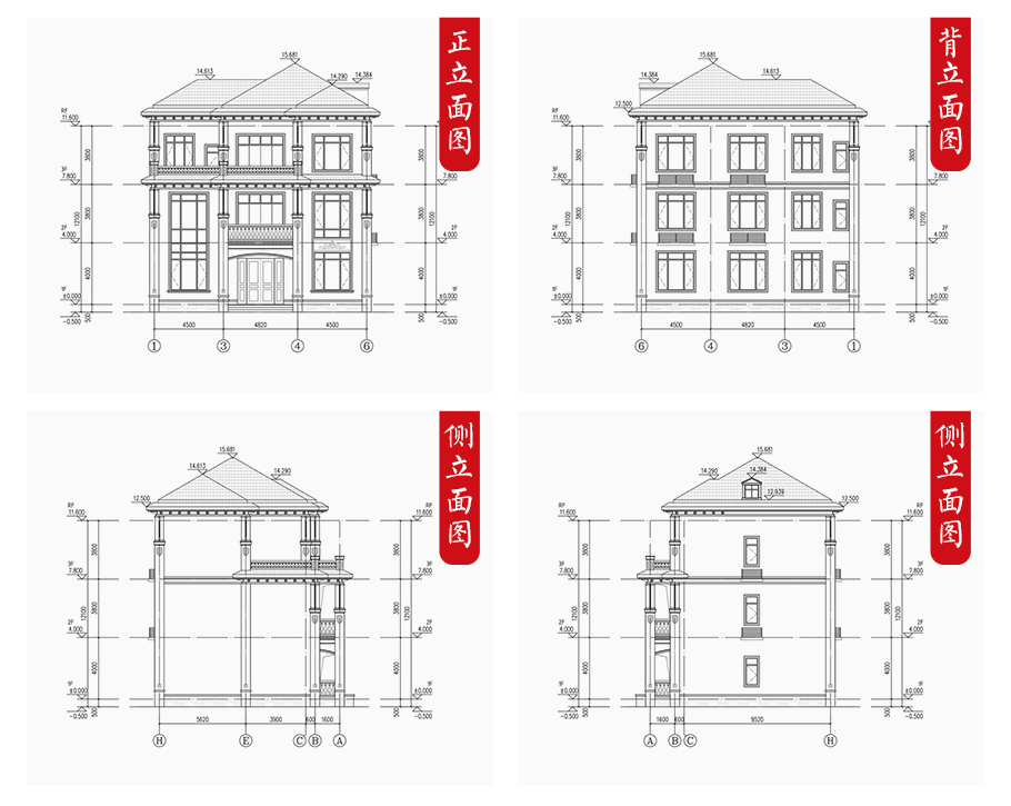 建筑平面圖:一層平面圖,二層平面圖,三層平面圖; 建筑立面圖:東立面圖,西立面圖,南立面圖,北立面圖,剖面圖; 大樣圖:樓梯詳圖,細部大樣,門窗大樣 |