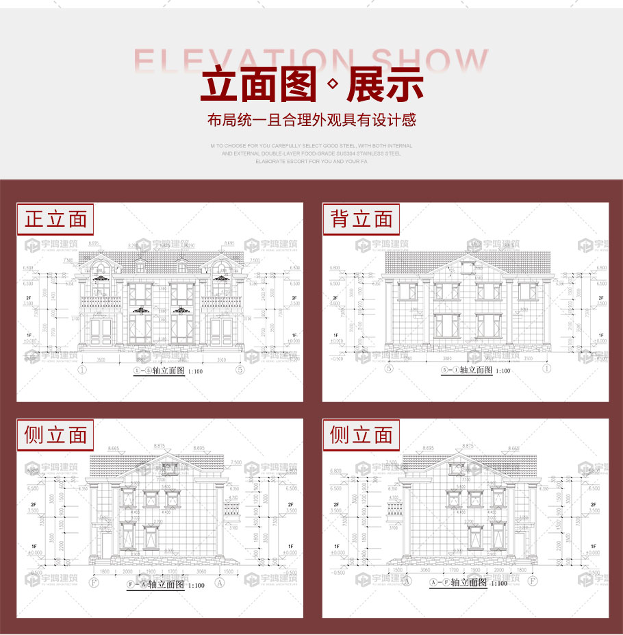 建筑圖: | 建筑平面圖:一層平面圖,二層平面圖; 建筑立面圖:東立面圖,西立面圖,南立面圖,北立面圖,剖面圖; 大樣圖:樓梯詳圖,細部大樣,門窗大樣 |