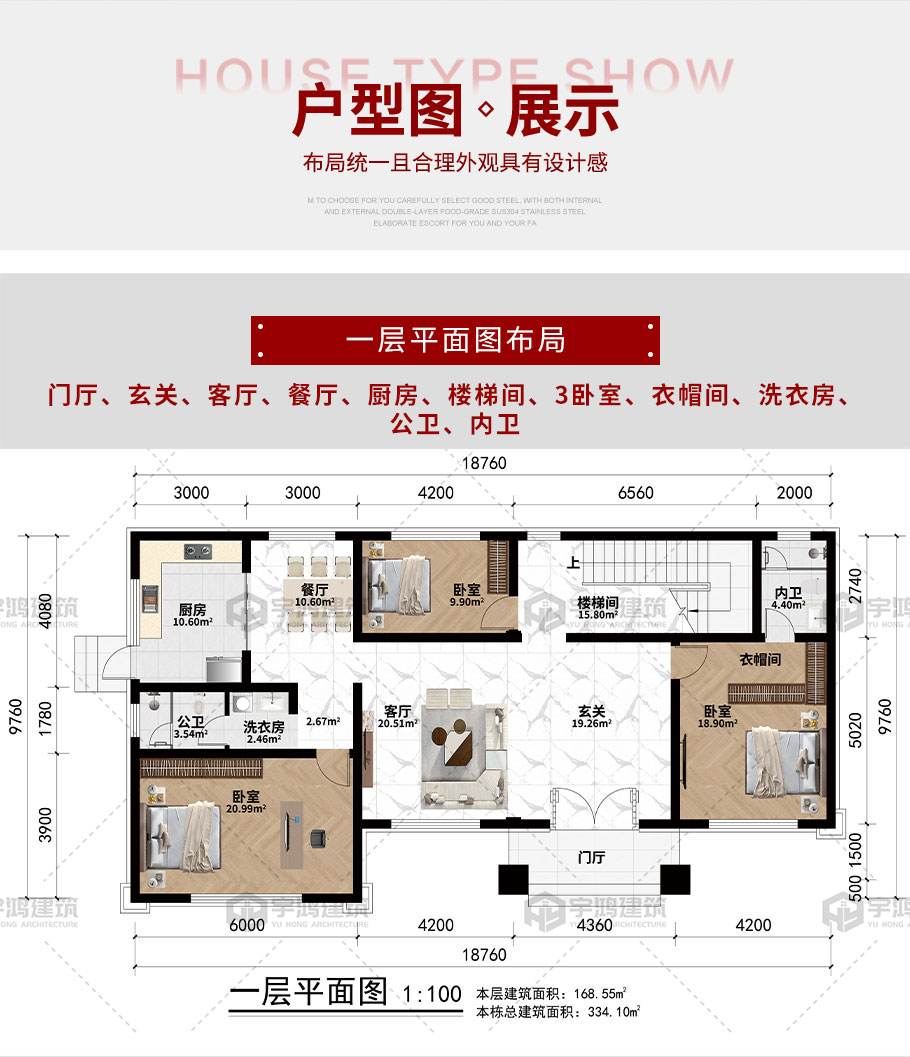 開間:18.76米 | 進深:9.76米 | 占地面積:173.12平方米 | 建筑面積:334.1平方米 |