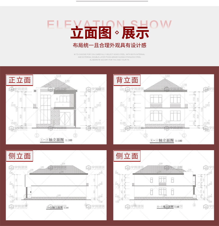建筑平面圖:一層平面圖,二層平面圖; 建筑立面圖:東立面圖,西立面圖,南立面圖,北立面圖,剖面圖; 大樣圖:樓梯詳圖,細(xì)部大樣,門窗大樣 |