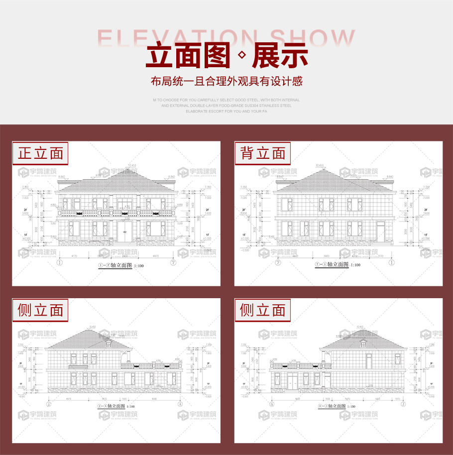 建筑平面圖:一層平面圖,二層平面圖; 建筑立面圖:東立面圖,西立面圖,南立面圖,北立面圖,剖面圖; 大樣圖:樓梯詳圖,細(xì)部大樣,門窗大樣 |