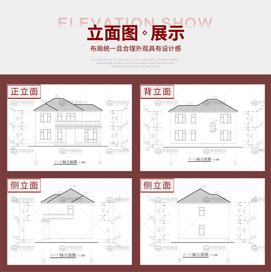 建筑平面圖:一層平面圖,二層平面圖; 建筑立面圖:東立面圖,西立面圖,南立面圖,北立面圖,剖面圖; 大樣圖:樓梯詳圖,細(xì)部大樣,門窗大樣 |