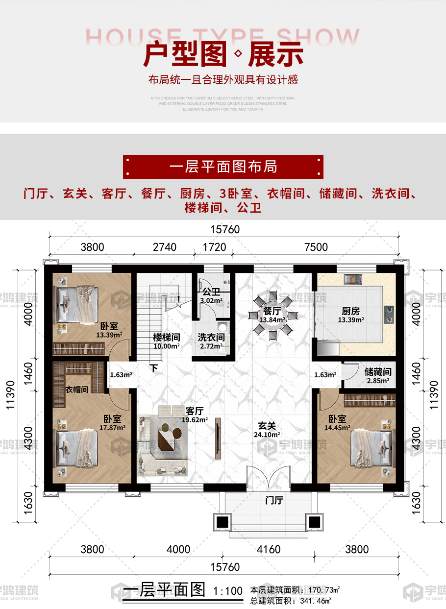 | 開間:15.76米 | 進深:11.39米 | 占地面積:175.14平方米 | 建筑面積:341.46平方米 |
