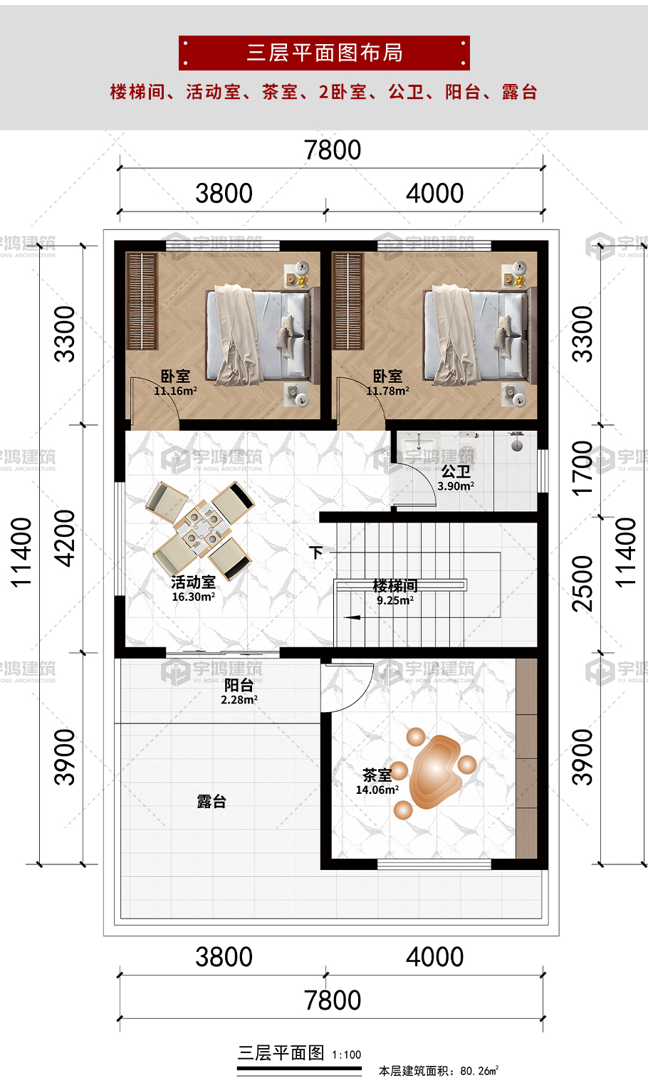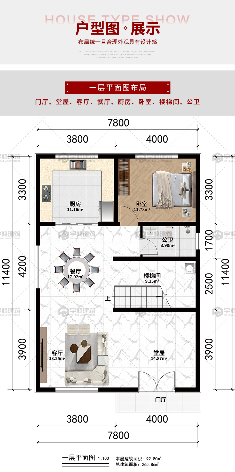 | 開間:7.8米 | 進(jìn)深:11.4米 | 占地面積:92.8平方米 | 建筑面積:265.86平方米 |