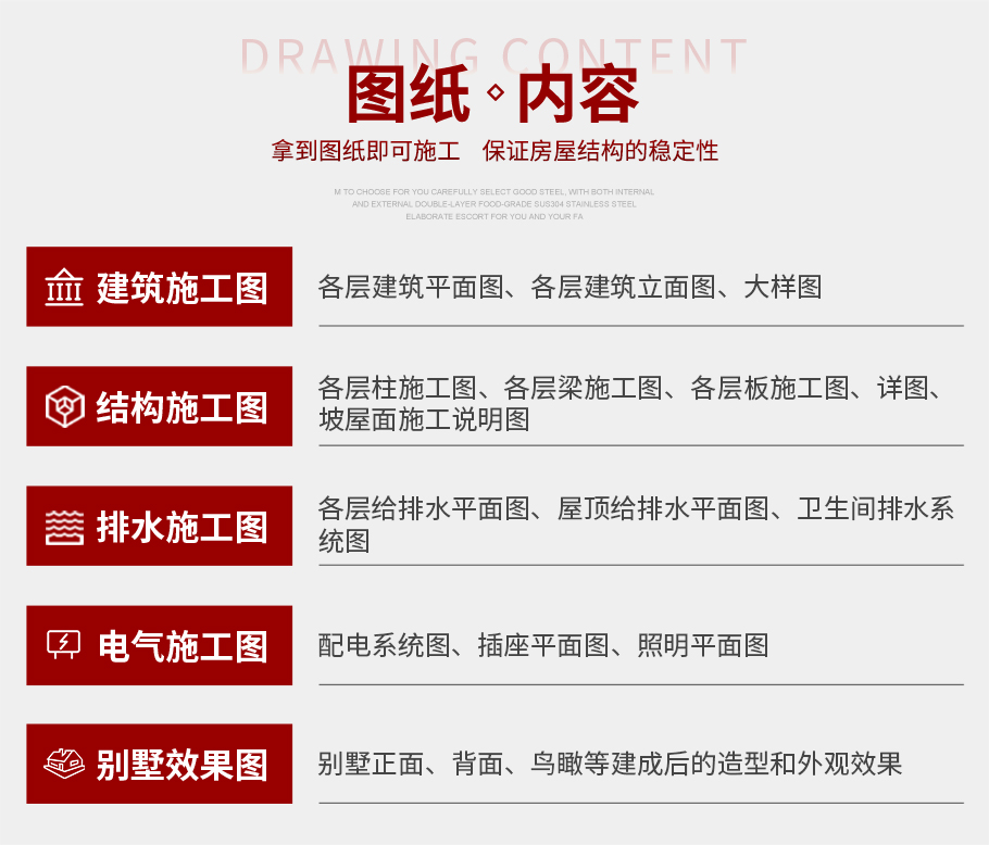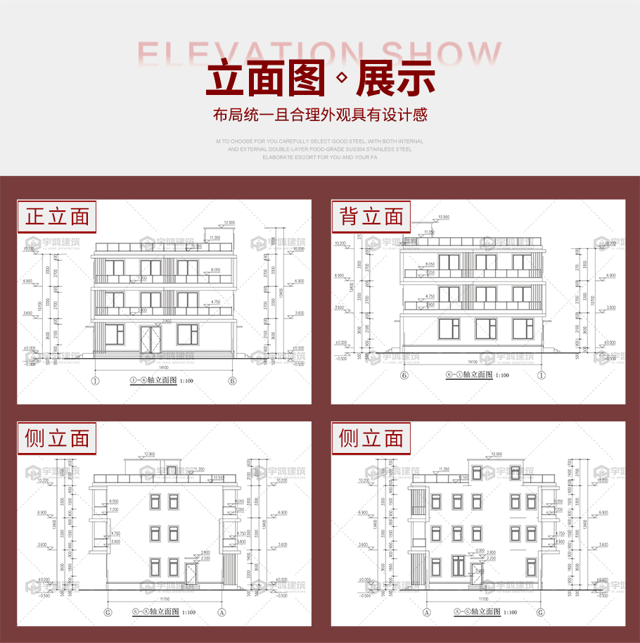 建筑平面圖:一層平面圖,二層平面圖,三層平面圖; 建筑立面圖:東立面圖,西立面圖,南立面圖,北立面圖,剖面圖; 大樣圖:樓梯詳圖,細(xì)部大樣,門窗大樣 |