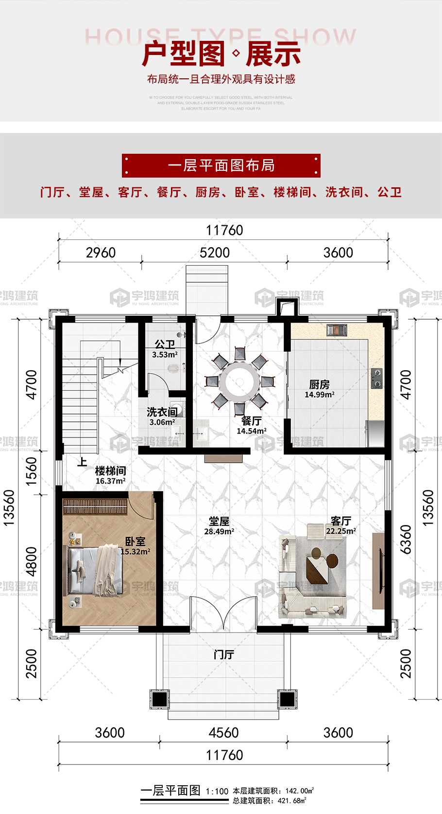 | 開間:11.76米 | 進深:13.56米 | 占地面積:149.03平方米 | 建筑面積:421.68平方米 |
