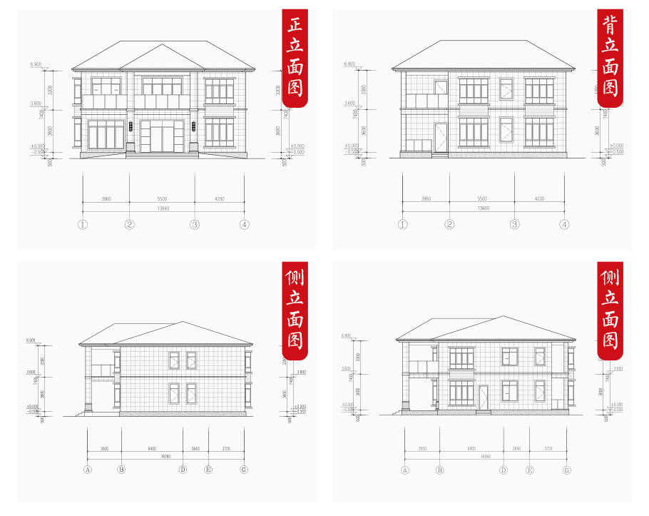 建筑圖: | 建筑平面圖:一層平面圖,二層平面圖; 建筑立面圖:東立面圖,西立面圖,南立面圖,北立面圖,剖面圖; 大樣圖:樓梯詳圖,細部大樣,門窗大樣 |